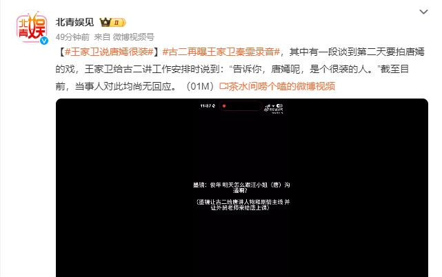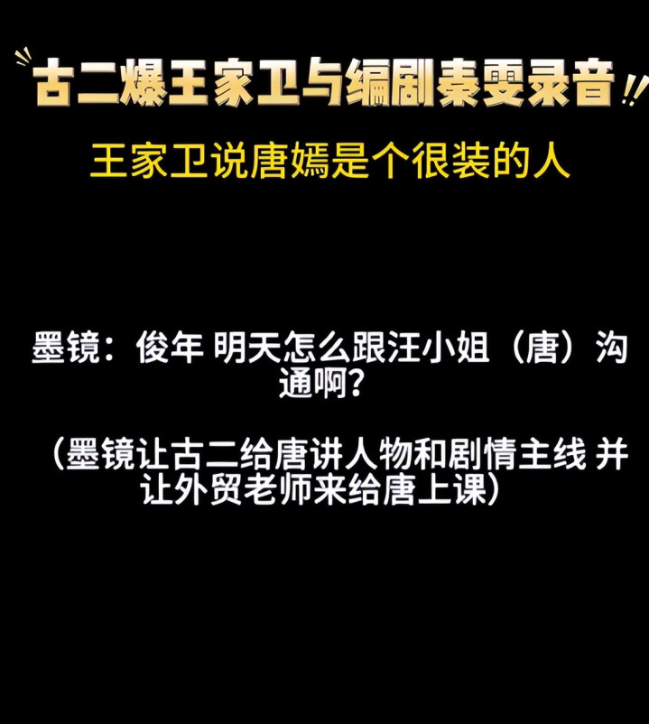 他接连放出多段录音,其中包括古二向秦雯讲解金融术语、王家卫批评秦雯剧本,要求古二写框架秦雯修改、王秦二人私下吐槽其他演员等等一系列内容。