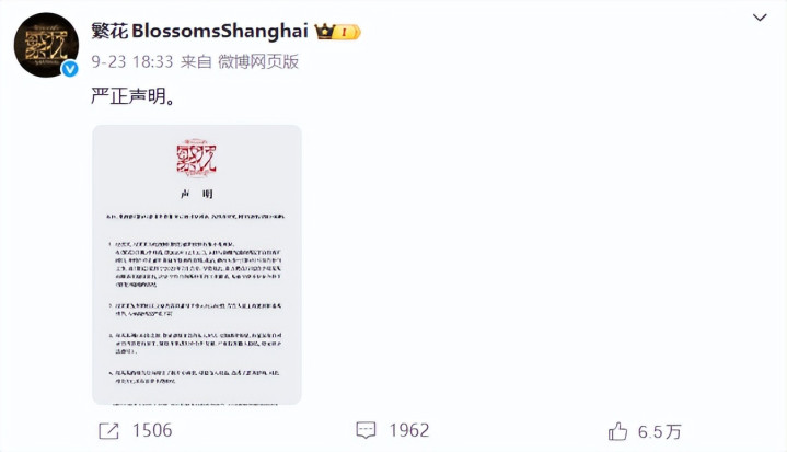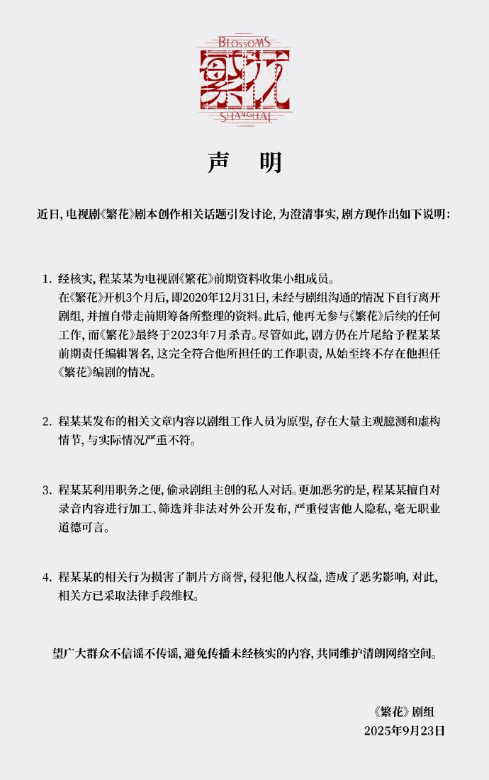 紧接着,《繁花》剧组也发了官方声明,内容跟秦雯的声明如出一辙。