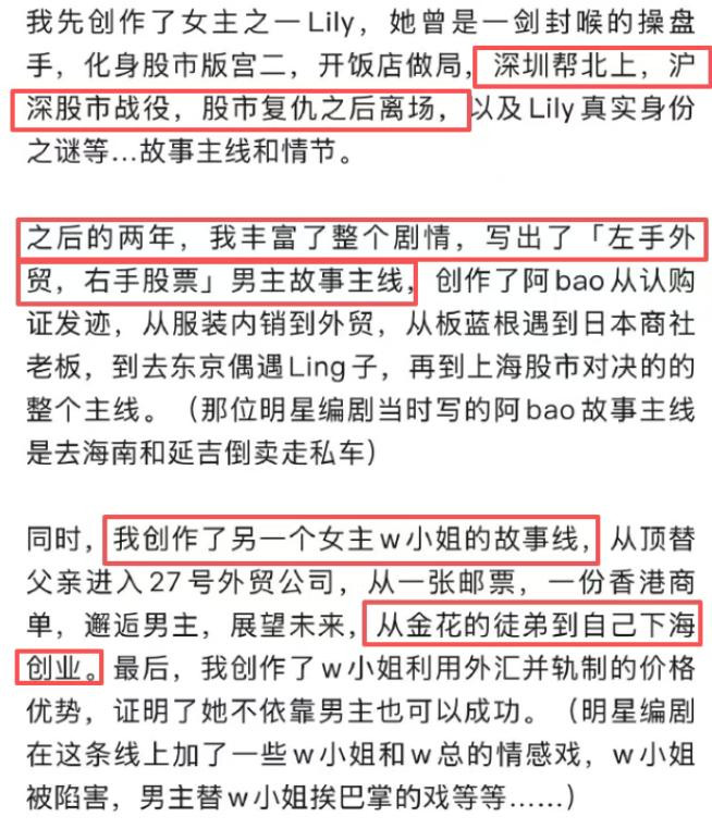 其中包括阿宝的金融线、李李的复仇线、汪小姐的创业线等等全剧的核心内容。