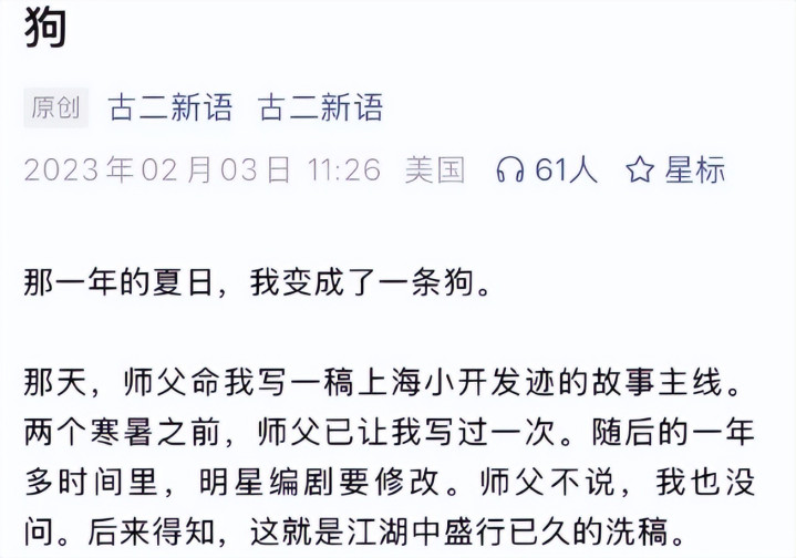 早在2023年年初,他就在自己的公众号《古二新语》中写了一篇名为《狗》的文章,疑似内涵《繁花》剧组种种乱象。