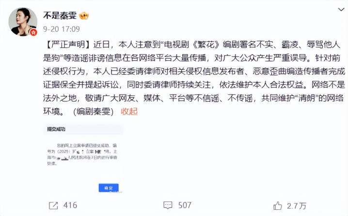 2025年9月20日,秦雯回应繁花编剧署名争议。